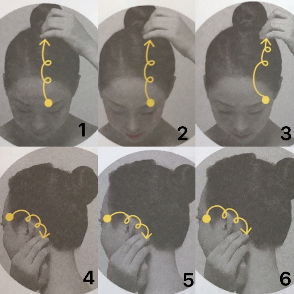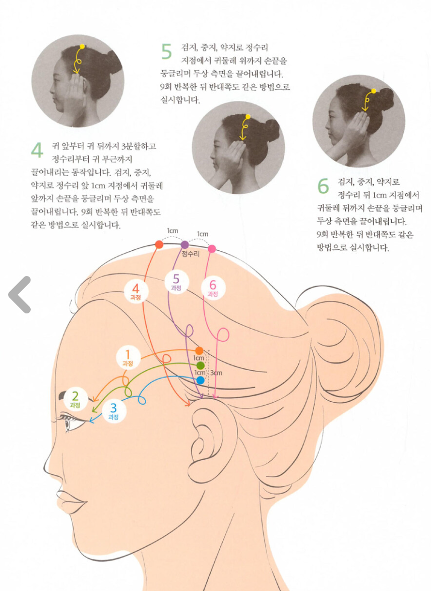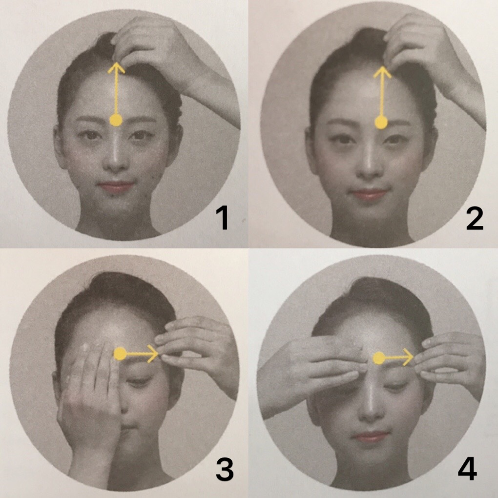 1. 중지 , 약지를 사용해 미간부터 헤어라인까지
