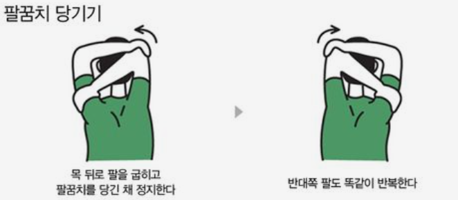 왼손으로 오른쪽 팔꿈치를 잡고 당긴다.