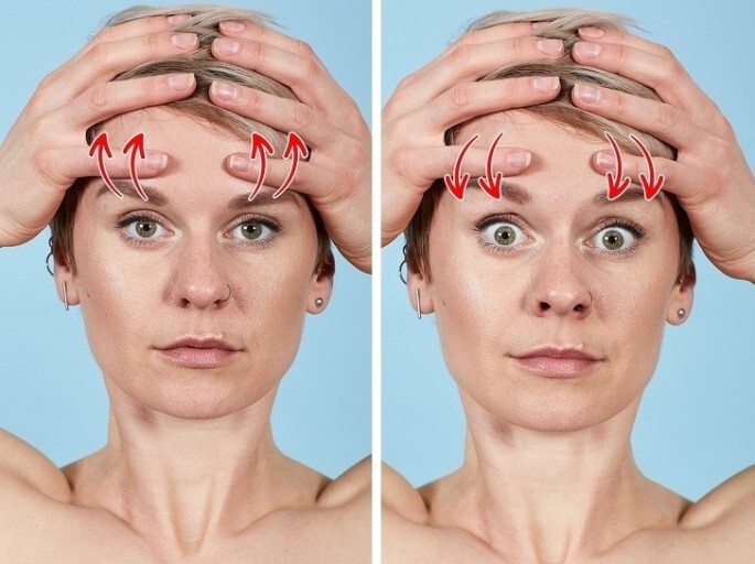 2) 눈썹과 눈꺼풀을 힘껏 위로 끌어올려