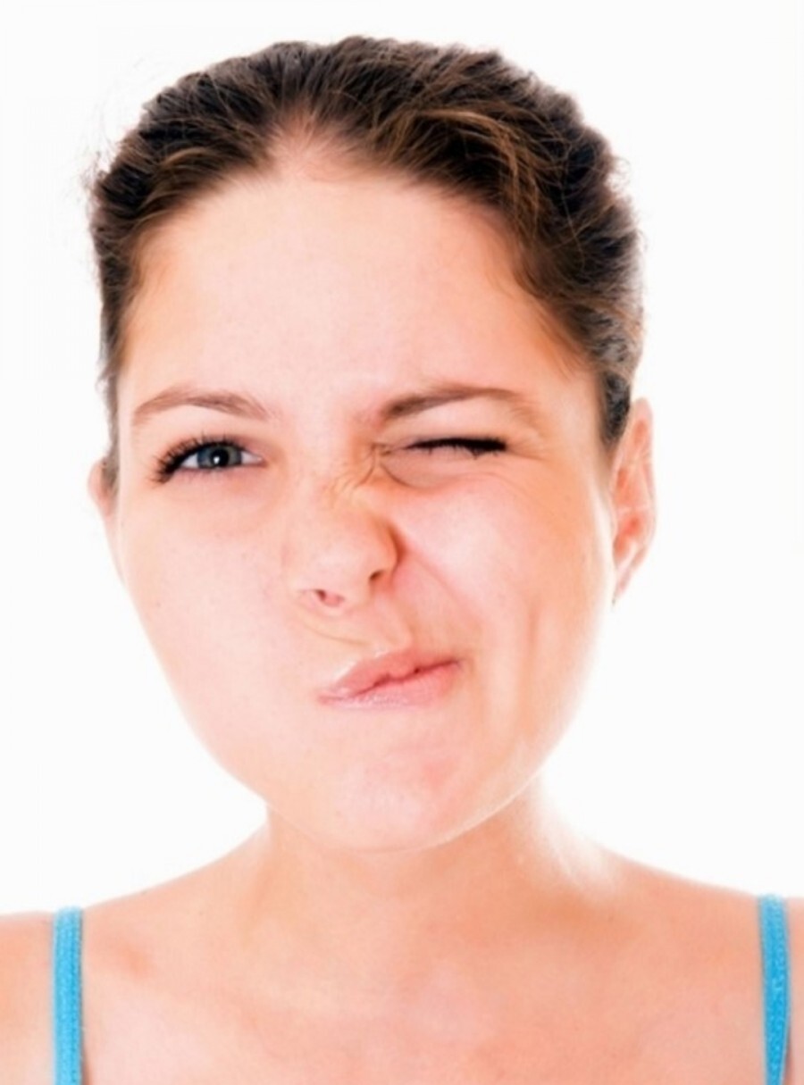1) 눈을 가늘게 뜨고 미간에 세로 주름을