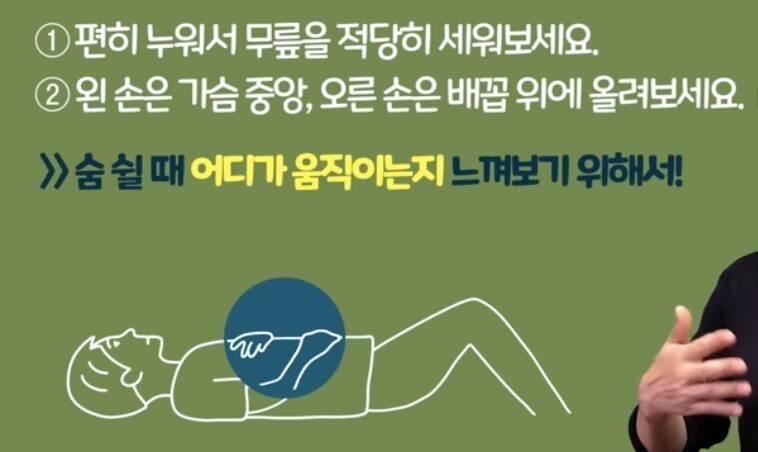 내쉴때 배로 갈비뼈를 꽉 조이는 느낌으로
