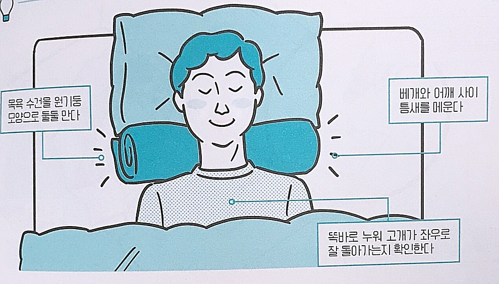 베개 아래쪽에 대고 똑바로 누워보자.